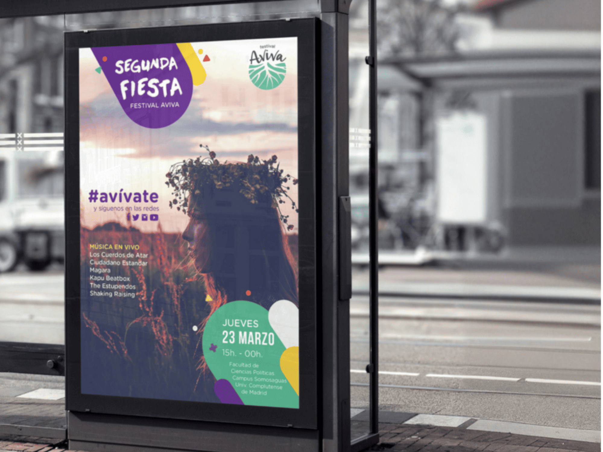 En 2016 se creó Aviva, un festival autogestionado por estudiantes de la Universidad Complutense de Madrid (UCM) que apostaba por la música emergente y la escena independiente. Para este proyecto se desarrolló una identidad visual inspirada en la tierra y la conexión natural, utilizando una estética orgánica basada en tonos verdes y lavanda que transmitían frescura, autenticidad y un vínculo directo con el entorno. El diseño de la cartelería y los materiales promocionales buscaba reflejar el espíritu alternativo del festival, resaltando su carácter universitario, independiente y colaborativo, al tiempo que conectaba emocionalmente con un público joven, creativo y abierto a nuevas propuestas culturales. El resultado fue una identidad única que no solo comunicaba el evento, sino que también reforzaba su personalidad como espacio de encuentro donde música y naturaleza se unían en una experiencia auténtica y cercana.